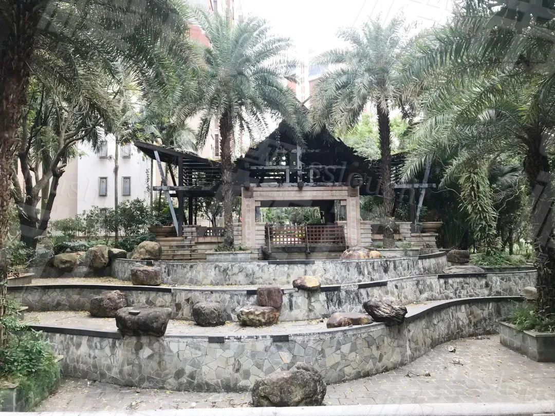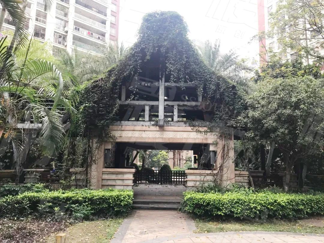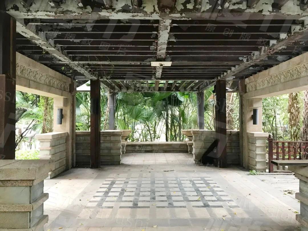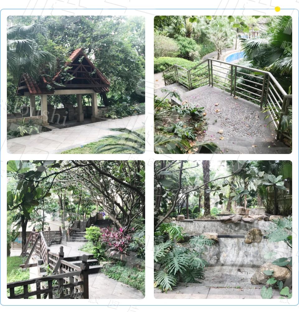 泳池周边绿植茂盛,花草种类繁多,树木遮天蔽日,就连泳池上方的凉亭都被植被覆盖了!
