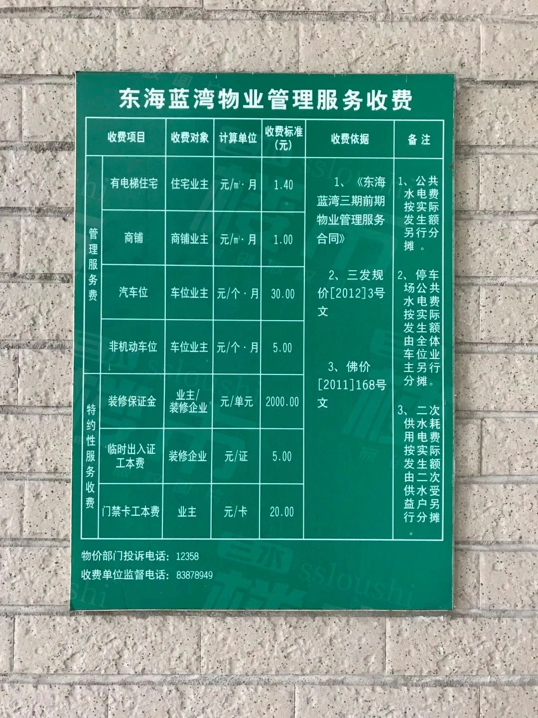 据了解,蓝湾首府物业目前由佛山市绿茵物业管理有限公司进行管理,在物业管理中心门口,房叔发现了小区的物业管理服务收费公示牌。