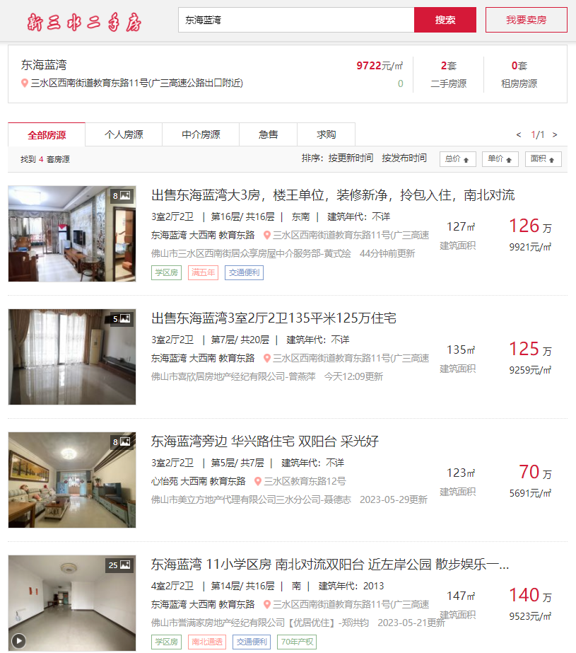 东海蓝湾原本算得上是三水比较受欢迎的小区,如今却因为外墙脱落的问题,成了鸡肋,不知道会不会影响其二手房流通?根据新三水房产网显示,目前东海蓝湾挂牌**的二手房并不多,挂牌均价9722元/平方米!